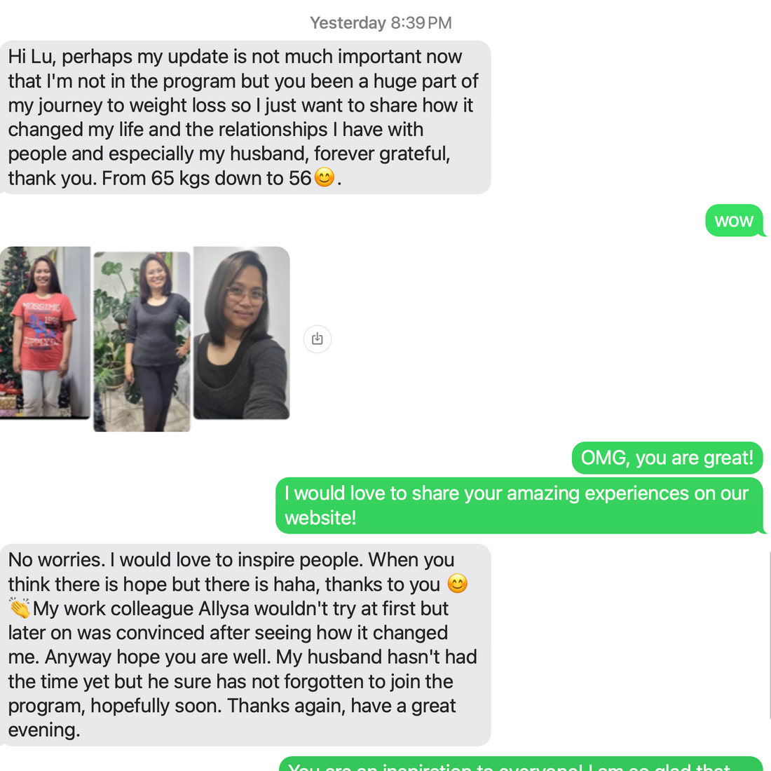 アイリーンさんの変身物語は、感謝、決意、そして静かな感動に満ちたものです。健康への旅を始めた時、彼女は体重65kgで、持続的な変化を起こす準備ができていました。指導、励まし、そして彼女自身の努力を通して、彼女はバランスの取れた栄養価の高いライフスタイルを実践するようになりました。それは、体に良い食事、意識的な選択、そして完璧さを求めるのではなく継続することに重点を置いたものでした。