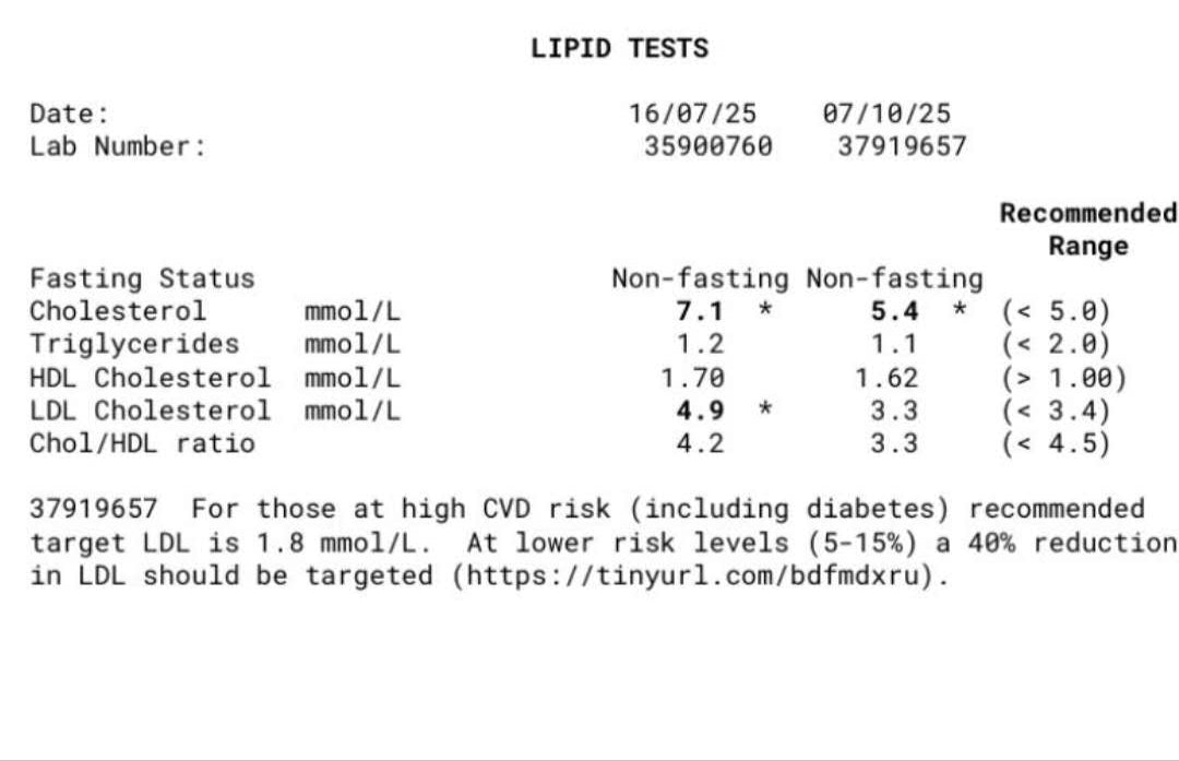 LOLU™ DASH Plate食事プランに従った結果、彼のコレステロール値は著しく改善しました。総コレステロール値は7.1 mmol/Lから5.4 mmol/Lに低下し、 LDL(悪玉コレステロール)値は4.9 mmol/Lから3.3 mmol/Lに低下しました。これは、彼の心臓血管疾患のリスクが低下したことを意味します。HDL (善玉コレステロール)値は健康的なレベルを維持し、トリグリセリド値も正常範囲内に留まりました。これらの結果は、彼が食事に加えた変化(より多くの果物、野菜、全粒穀物、そして健康的な脂肪を摂取すること)が、彼の心臓血管の健康全般の改善に大きな違いをもたらしたことを示しています。