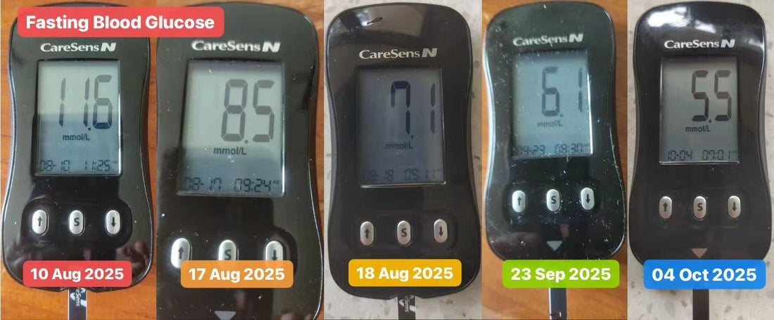 👉 11.6 mmol/L → 8.5 mmol/L → 7.1 mmol/L → 6.7 mmol/L → 6.1 mmol/Lと減少し、最終的に5.5 mmol/Lに達し、これは健康的な範囲内です!