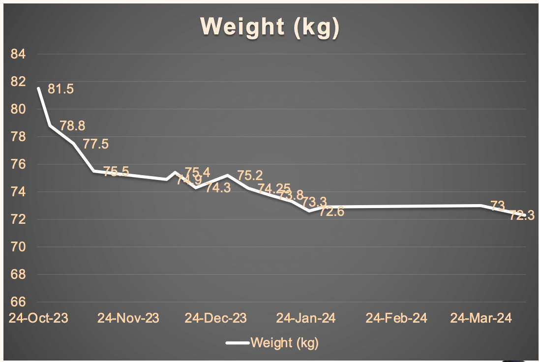 2023年11月までに、彼女はすでに数キロの減量に成功し、体重は75.5kgにまで減少した。これは、より健康的な食生活とアクティブなライフスタイルが効果を発揮していることの明確な兆候である。彼女の進歩は12月と1月を通して着実に続き、 72.6kgに達した。これは、彼女の強い規律と献身を反映している。